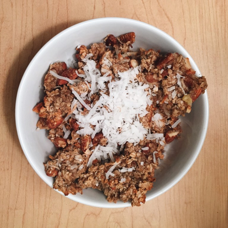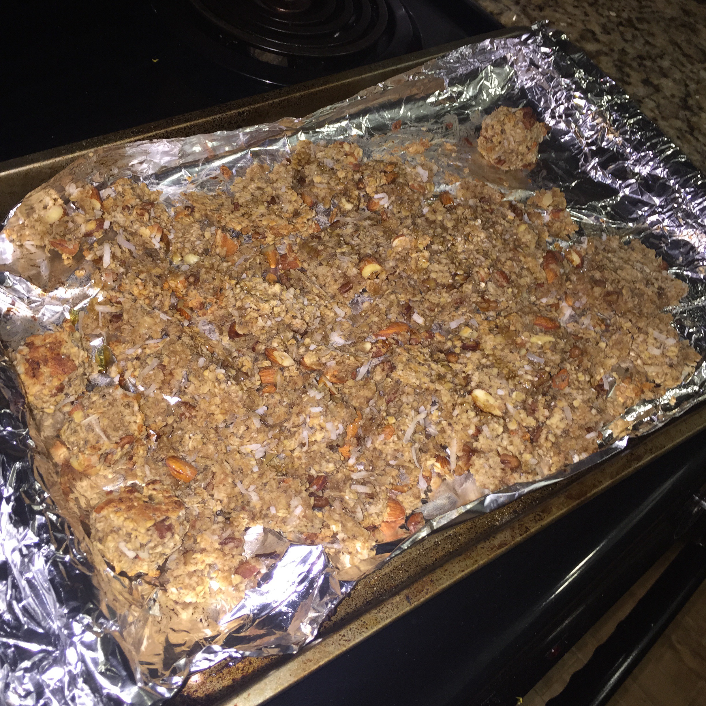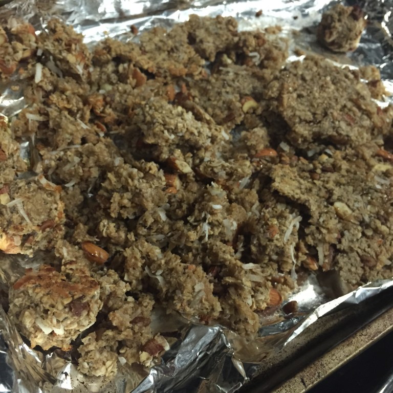 Spread on cookie sheet lined with parchment paper or tin foil. Bake 400 degrees for 10 minutes, turn over the granola, then finish off in the oven for 7 minutes. Voila!