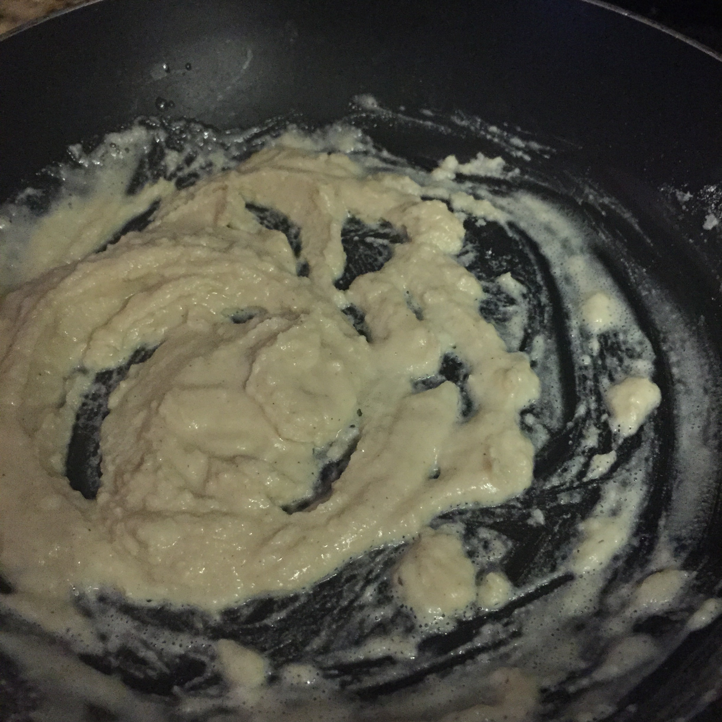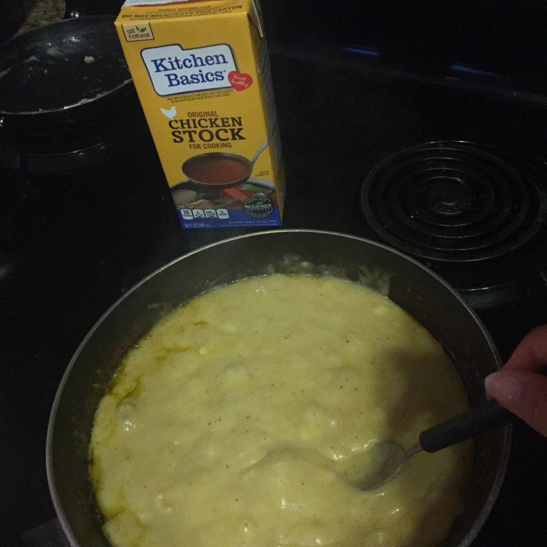 3. In a large pan, combine chicken jus and Béchamel sauce, whisk on medium-high heat for 5 minutes, until consistency is like an Alfredo sauce. Add 1-2 tsp salt/to taste!