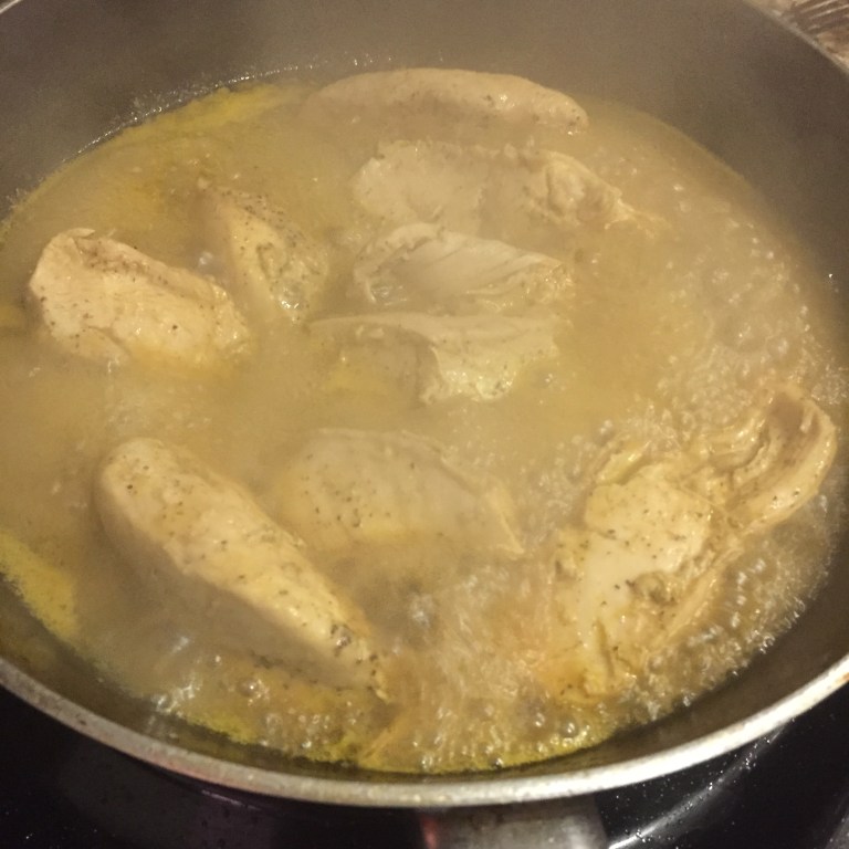 1. Cook chicken breast and cut into strips. Keep the jus for later.