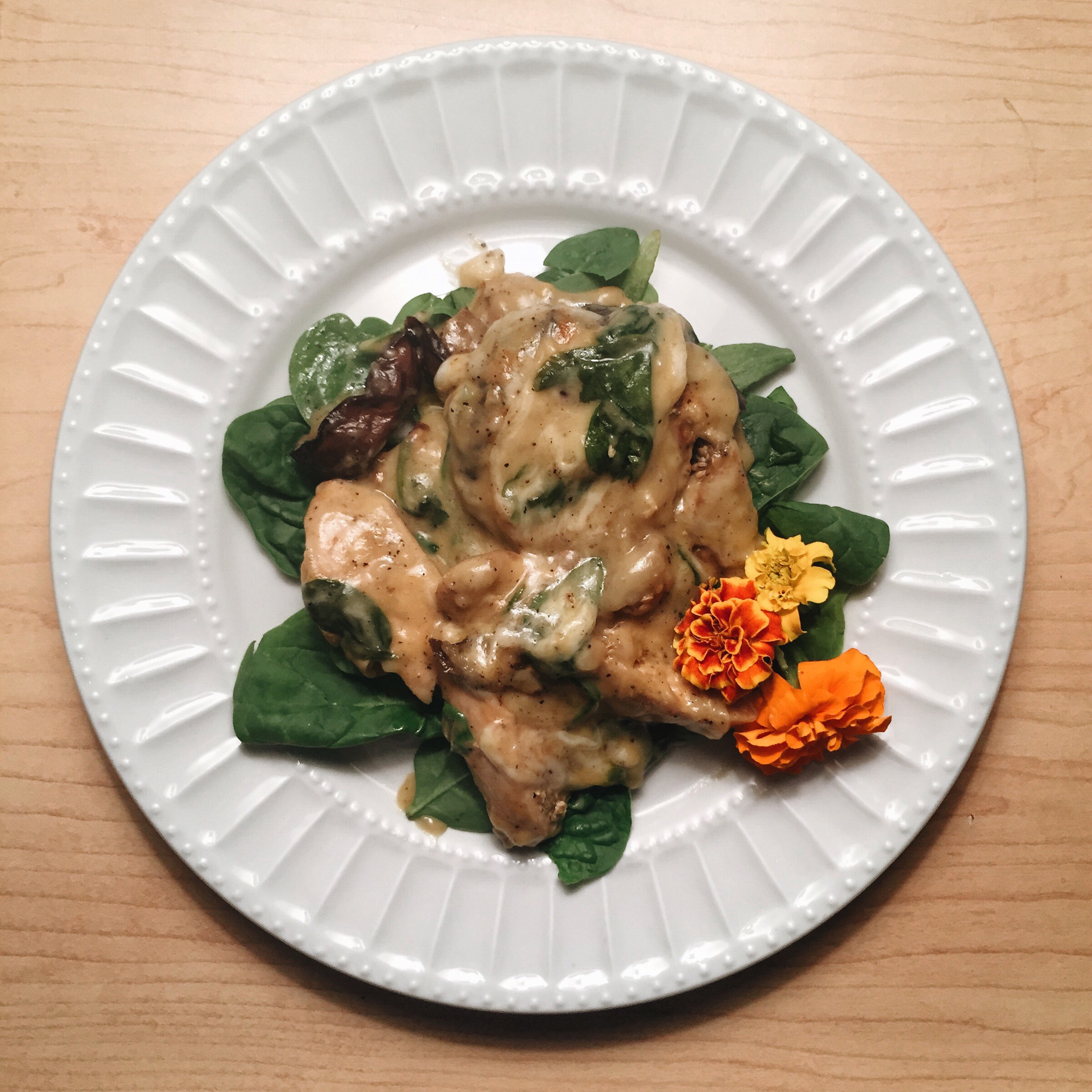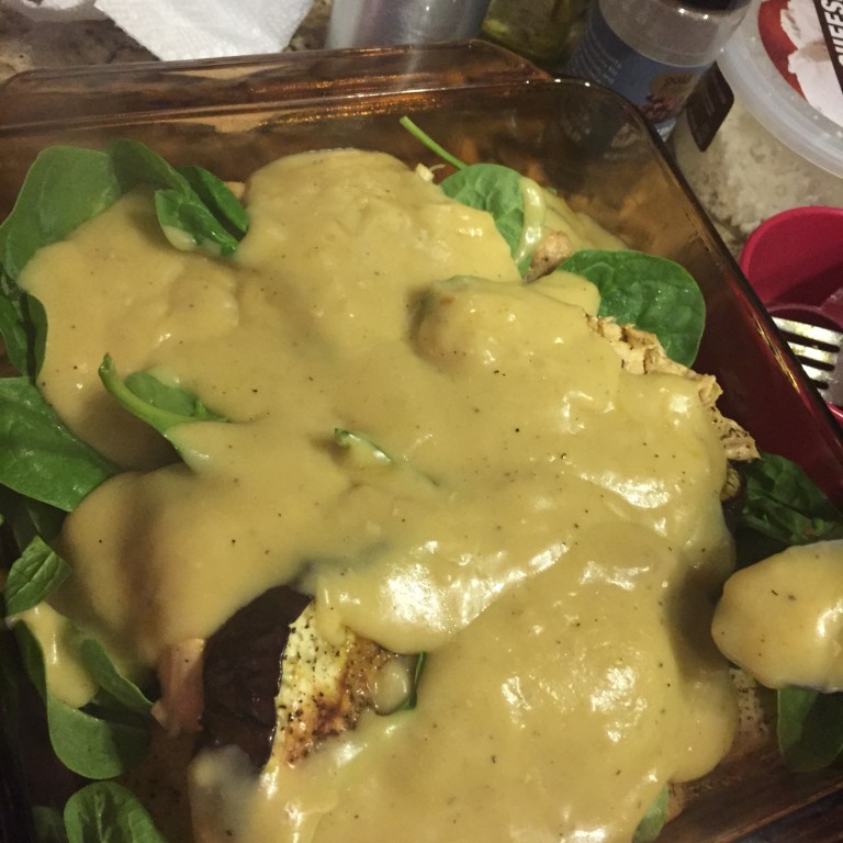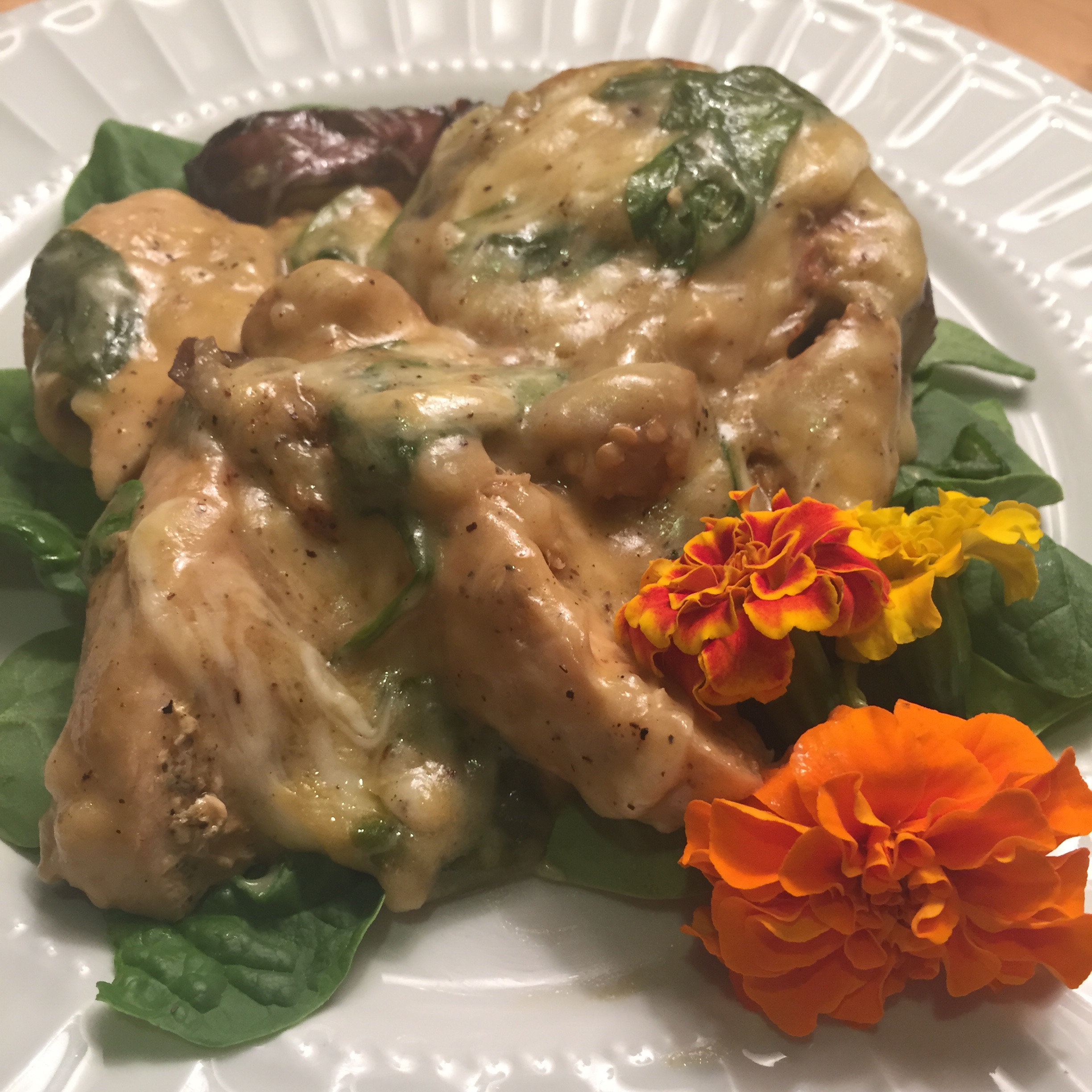 In baking pan: spinach, cooked chicken, and mozzarella (optional)