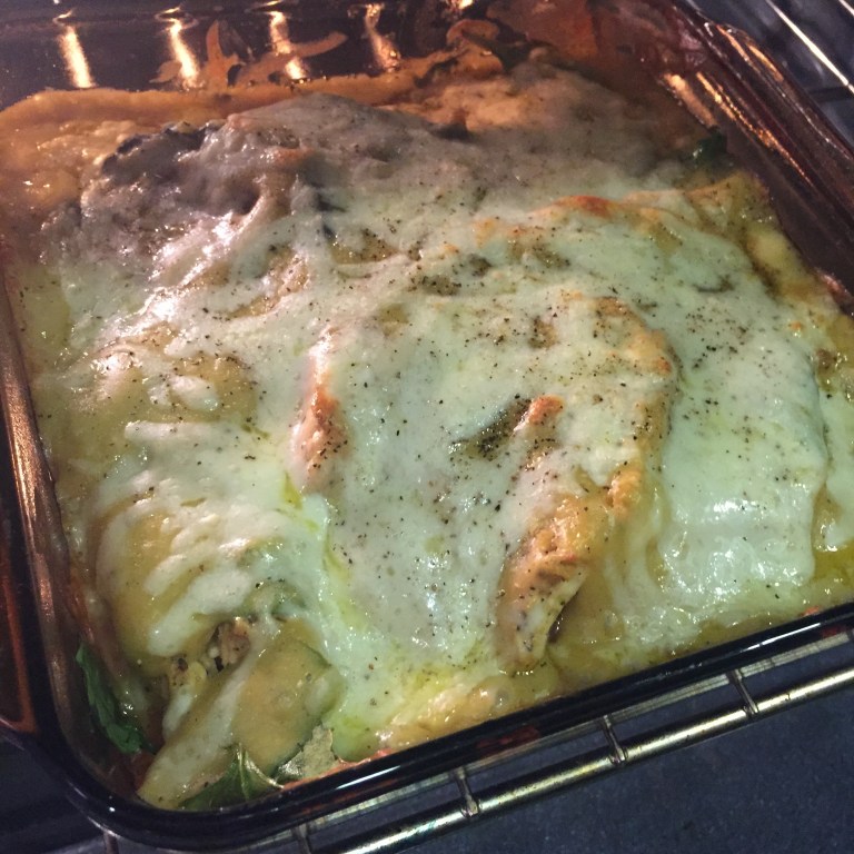 4. Layer eggplant slices, spinach, chicken, and Béchamel sauce. Top with salt and pepper. Bake for 10 minutes on 400 F.