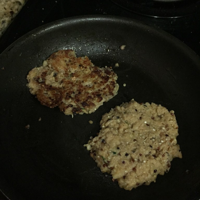 3. Heat pan with olive oil or butter in a nonstick pan. Cook each patty (or just dollop 1 tbsp at a time for 2 minutes on each side) 3-5 minutes each side or until brown on each side.