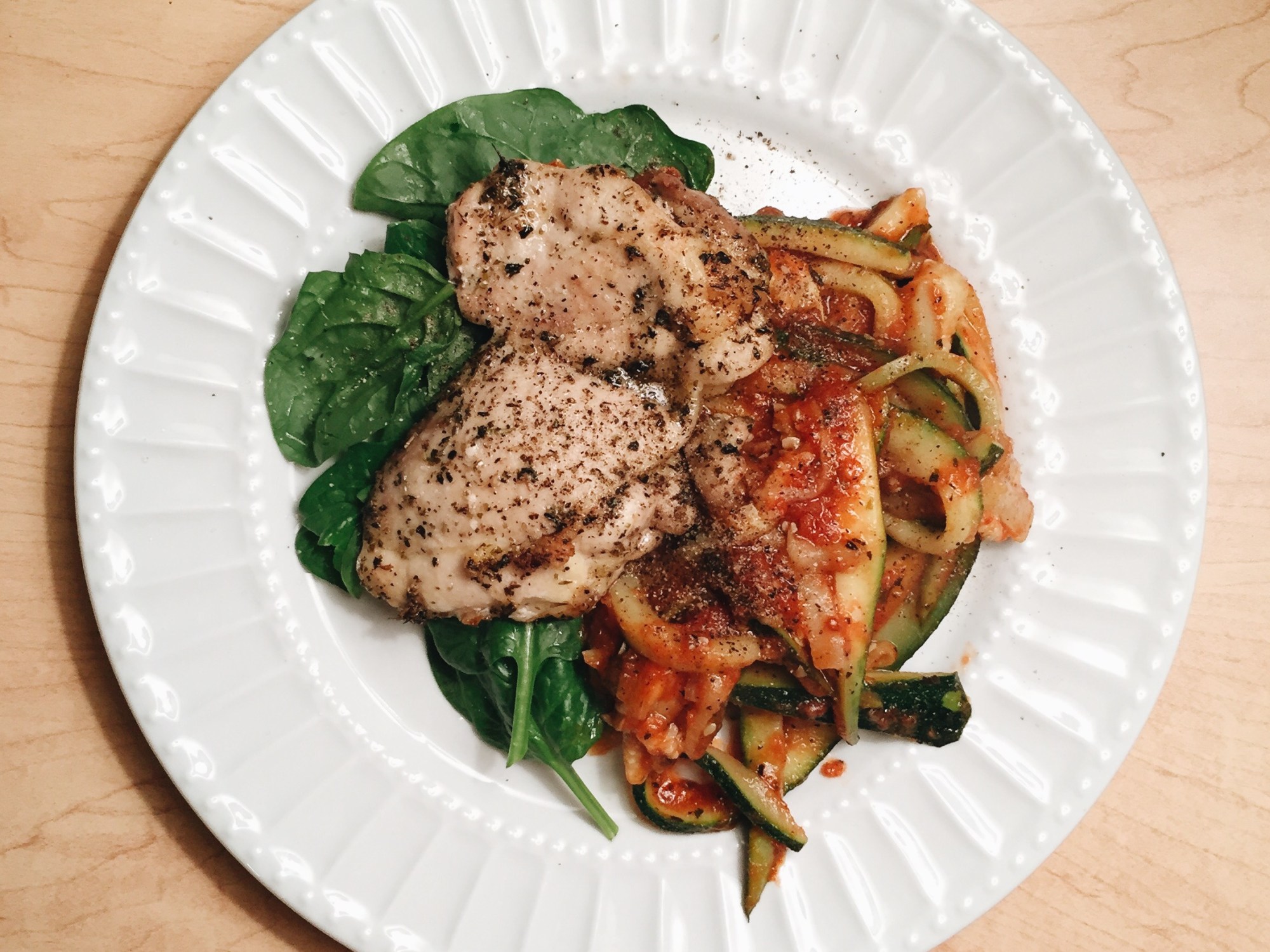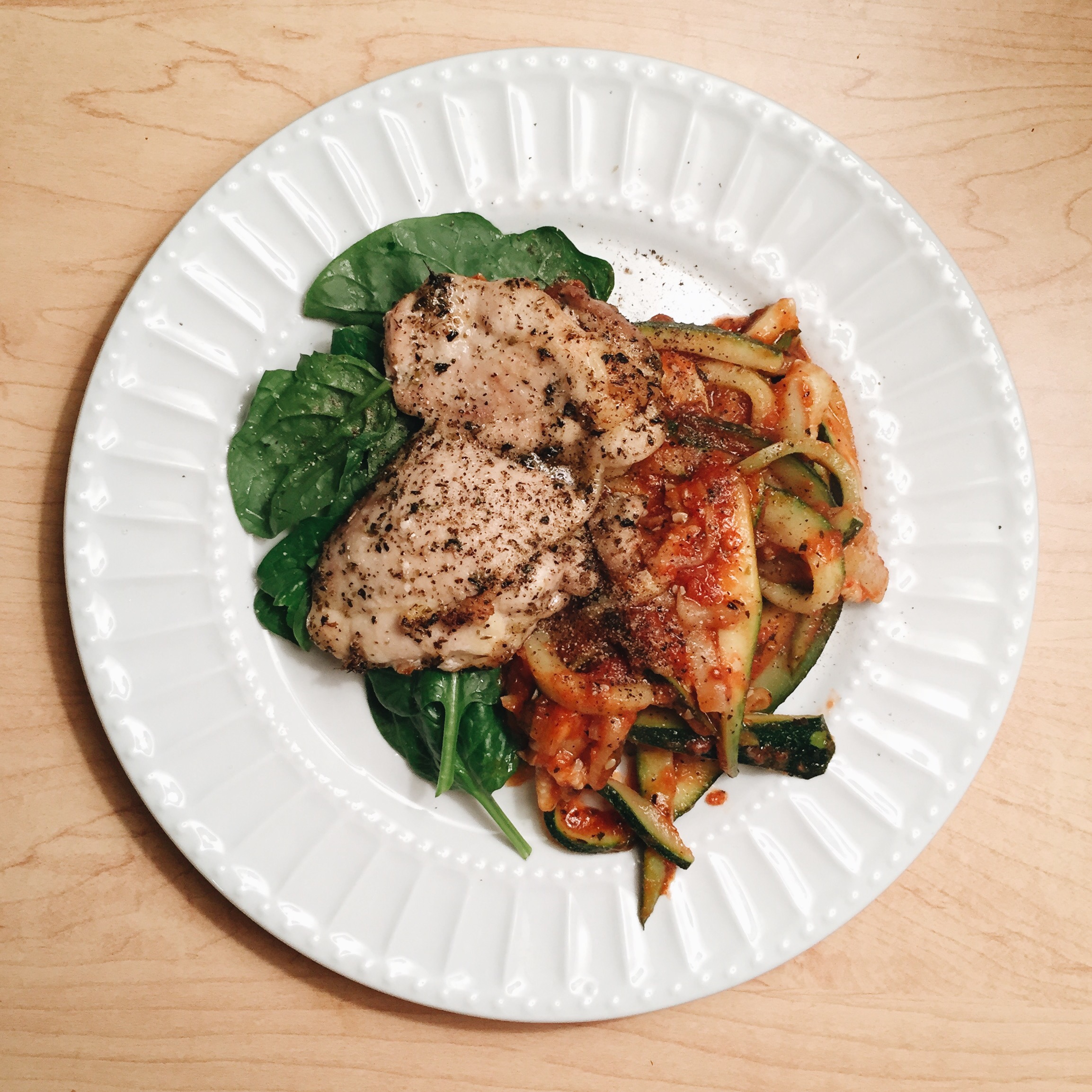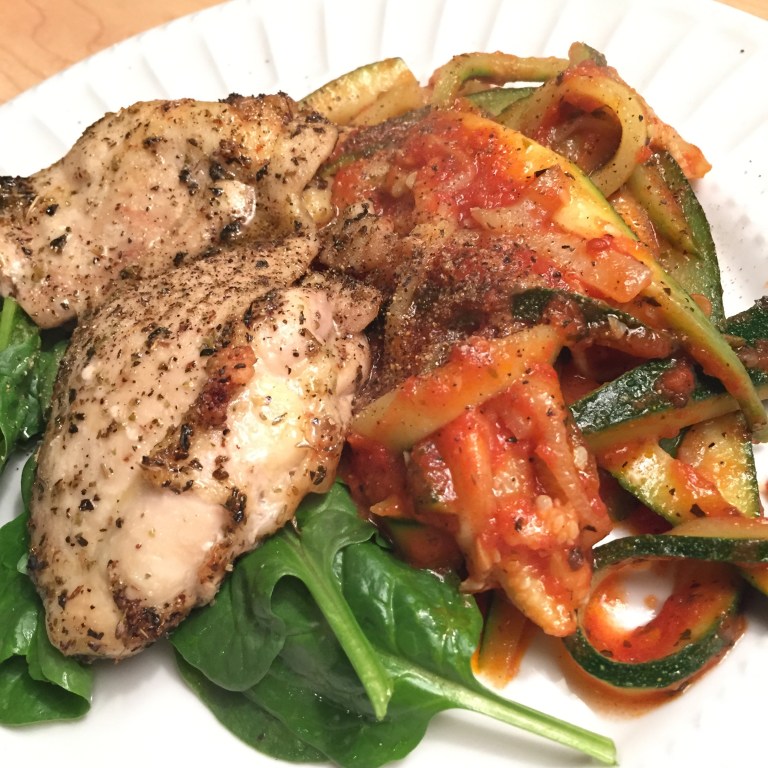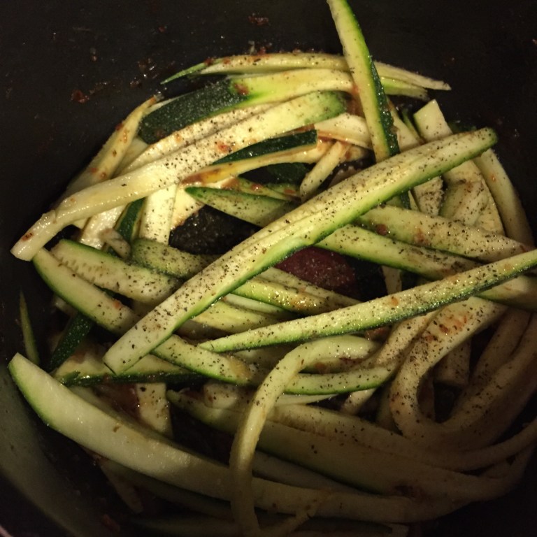 1. Spiralize (with a Vegetti) zucchini (I don’t have a Vegetti, so I just sliced it thinly, you can also use a cheese grater)