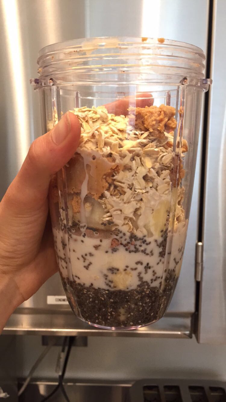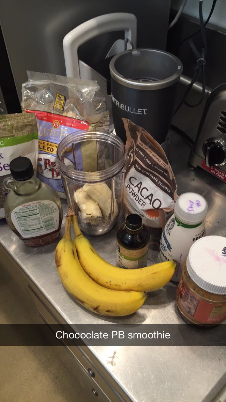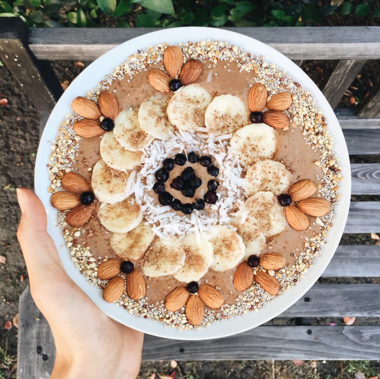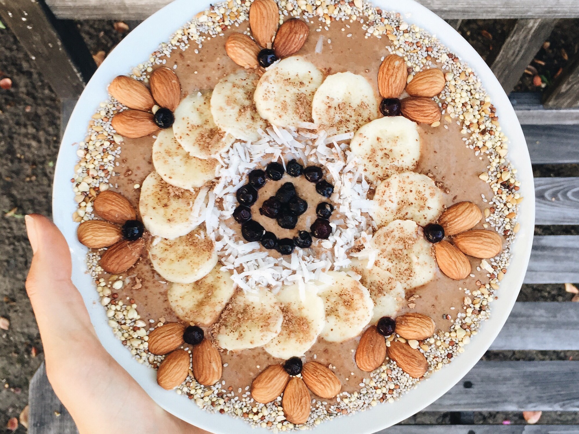 RAW CHOCOLATE PB BOWL🍌blend 2 bananas, a splash of vanilla extract, 1 tbsp peanut butter, a hint of cinnamon, 1 tbsp cacao powder, a splash of maple syrup, and 2 tbsp rolled oats