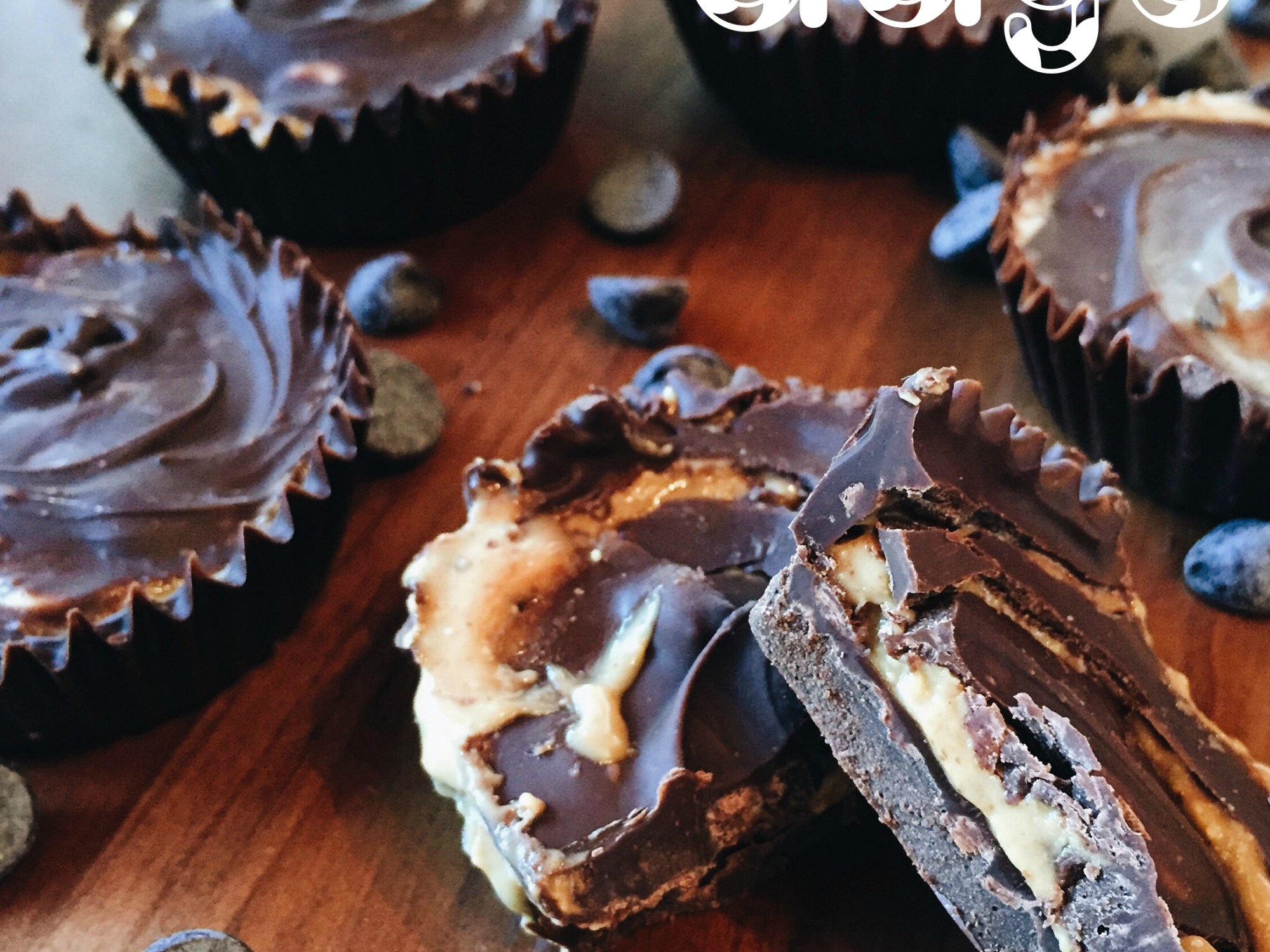 - Dollop desired amount of peanut butter in the center of the cups. Cover with the reminder of melted chocolate and swirl with a spoon to obtain desired effect.