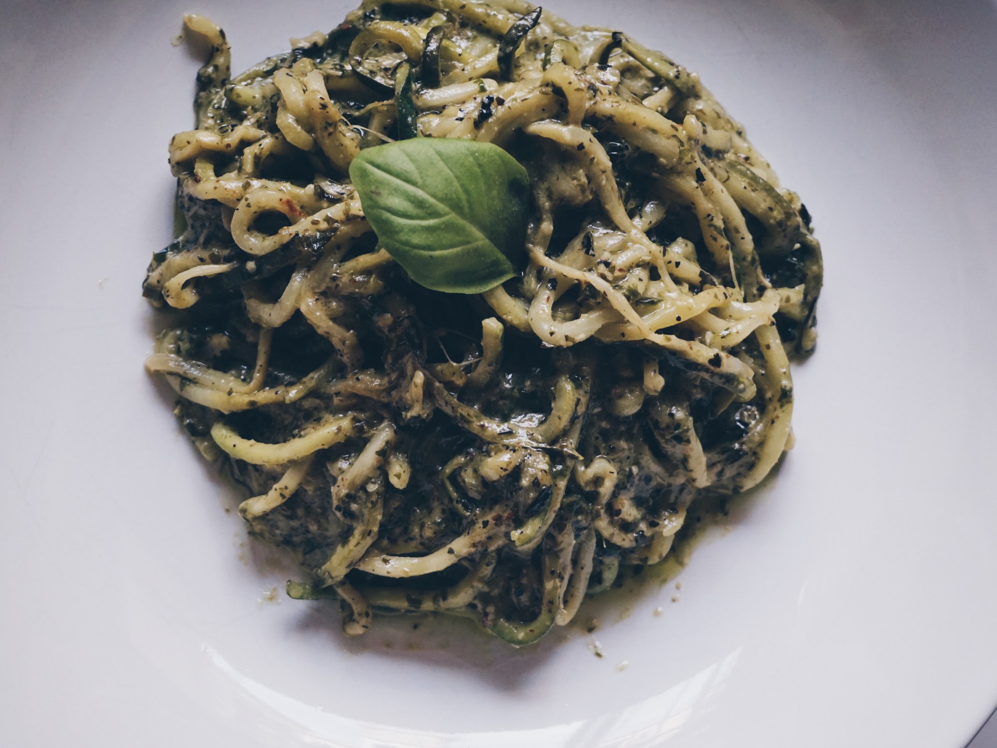 - Top with pesto (enough to cover the zoodles), about 1/2 c. Let cook and toss with tongs.